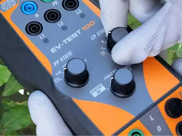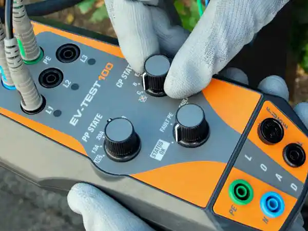 Az EV-TEST100 jármű töltőállomás teszter megfelelő HT készülékkel kombinálva szimulálja a töltőállomáshoz csatlakoztatott elektromos járművet, lehetővé téve a töltőállomás összes funkciójának és érintésvédelmének ellenőrzését. Az EV-TEST100-al 2. és 3. töltési móddal és 2. típusú csatlakozóval rendelkező a töltőállomások tesztelhetők.