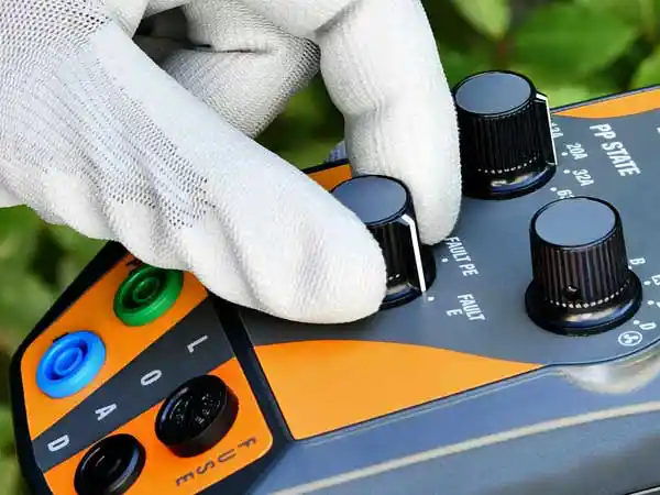 A gombbal egymás után lehet elvégezni a védővezető-szakadás (PE hiba) és a CP jel hiba szimulációját (E hiba)